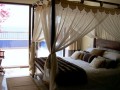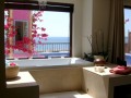 The two remaining bedrooms are on the upper floor and have access to another terrace. There is a good sized guest room with en suite bathroom and then there is the master bedroom with includes a raised bath platform and a separate steam-shower, both with sea views. Leading off the bedroom you find the walk-through wardrobe ending in the bathroom with a dark wood vanity-unit with a stone top, heated towel-rail, WC and bidet.
