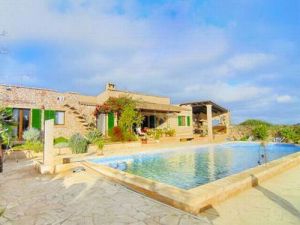 Idyllic, recently-built country home on the outskirts of Santanyi. The house (including outhouse) of 220sqm consists of 3 bedrooms, 2 bathrooms (1 ensuite), a wc, vaulted living/dining room with fireplace, study and fully fitted kitchen. The property has air conditioning , underfloor heating throughout, a garage, summer kitchen/ barbecue house and magnificent infinity pool. Furthermore, there is good road access, a dry stone wall surrounding the entire plot and all manner of fruit trees and vegetables in the garden. Quite simply a beautiful country retreat with stunning views.